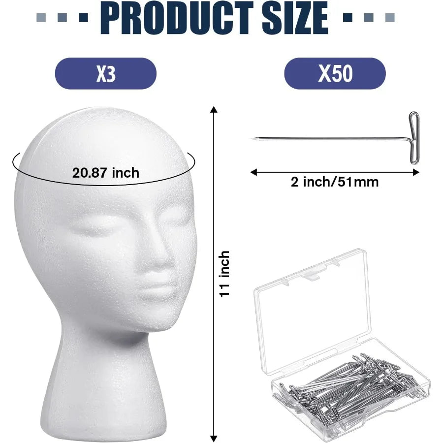 Lot de 3 Têtes en Mousse avec Épingles – Support Mannequin pour Perruques 28 cm