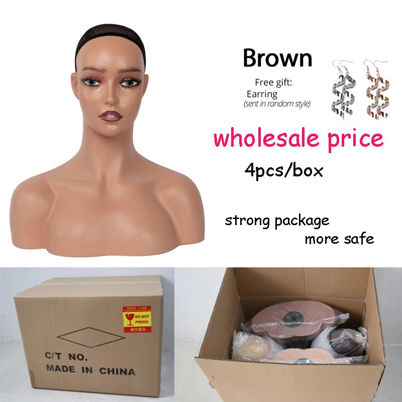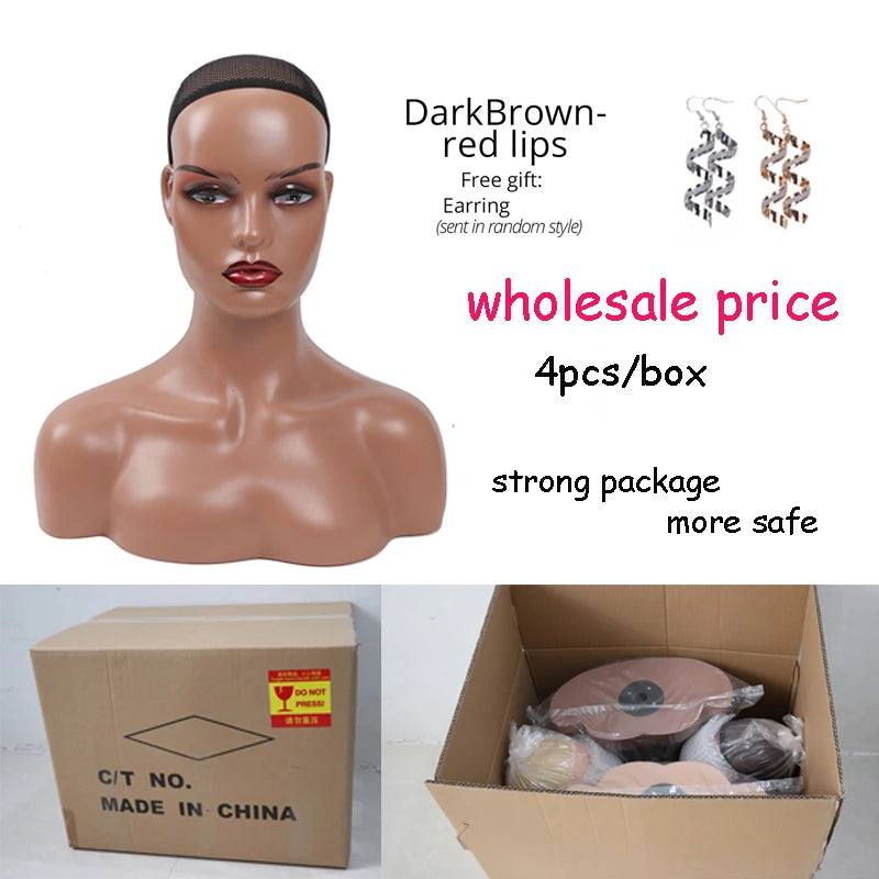 Lot de 4 Têtes Mannequin Femme avec Épaules – Modèles Réalistes Brun Foncé pour Perruques et Accessoires